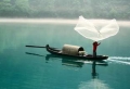过了段时间我们请来了一位老渔翁,老模特作为大家的雾中江面撒网人,太阳越来越高,气温也在升高,江面的雾在慢慢的散去。老人在江中不停的撒网,时而用白色的时而用黄色的网,他的狗站在船头,给人船就是家的感觉;老人累了、也热了,脱去外衣赤膊上阵了。