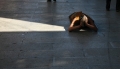 2006年国庆黄金周,我有幸去西藏旅游,大昭寺八角街上那些特有的民俗风情和虔诚的朝圣者吸引了我的眼球,我始终举起相机紧紧的寻找目标,在八角街突然出现了一位腿患残疾的年轻喇嘛迎面跪拜而来,我眼睛顿时一亮,感觉这是苍天赐予的饱含虔诚和的绝妙素材,为了能更好的突出主体、增强画面的视觉冲击力,我选择朝拜者恰好举手趴在地下那一束侧逆光的瞬间按下快门。从而使这千载难逢的瞬间显得是那么自然纯朴、光影和谐。